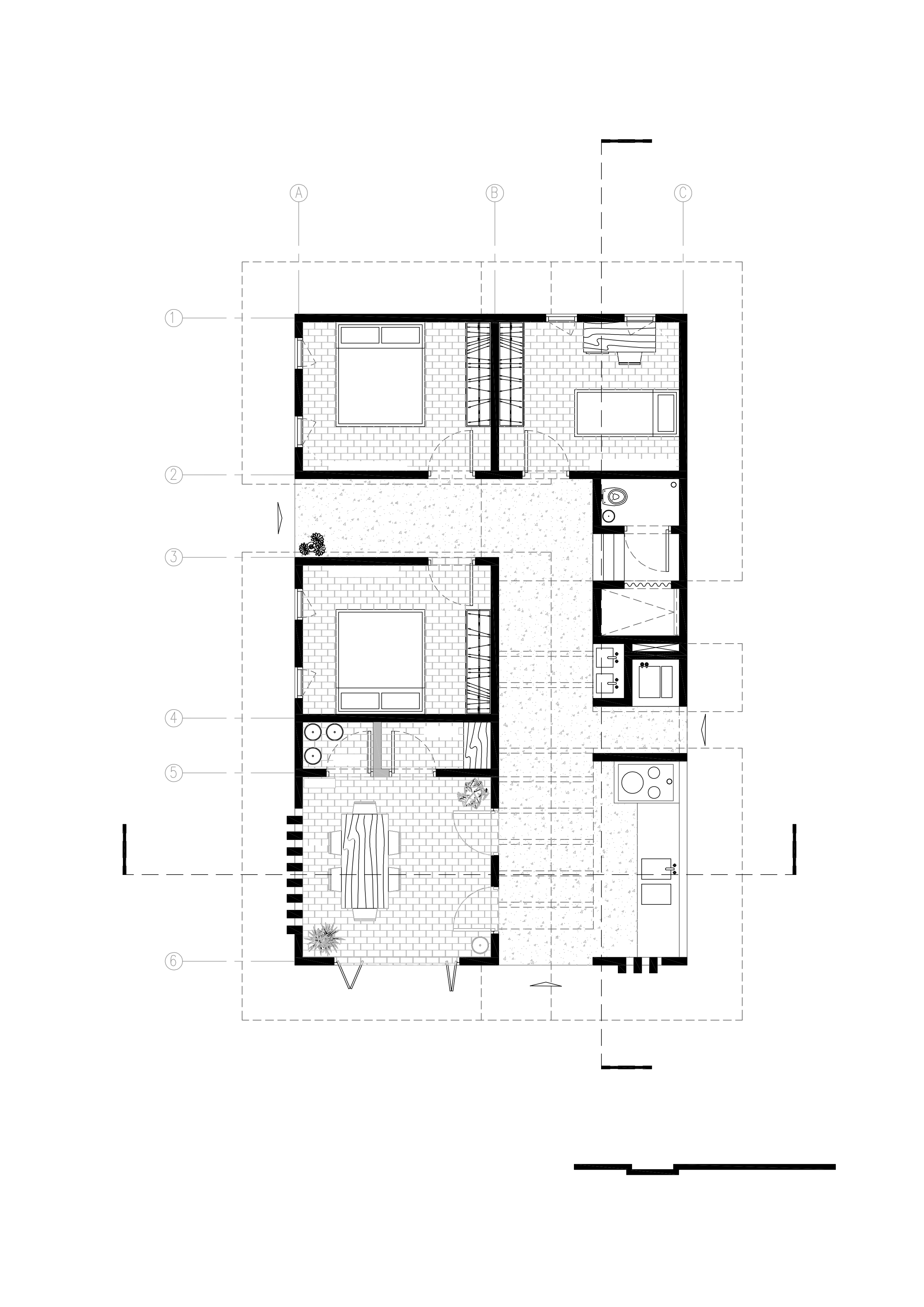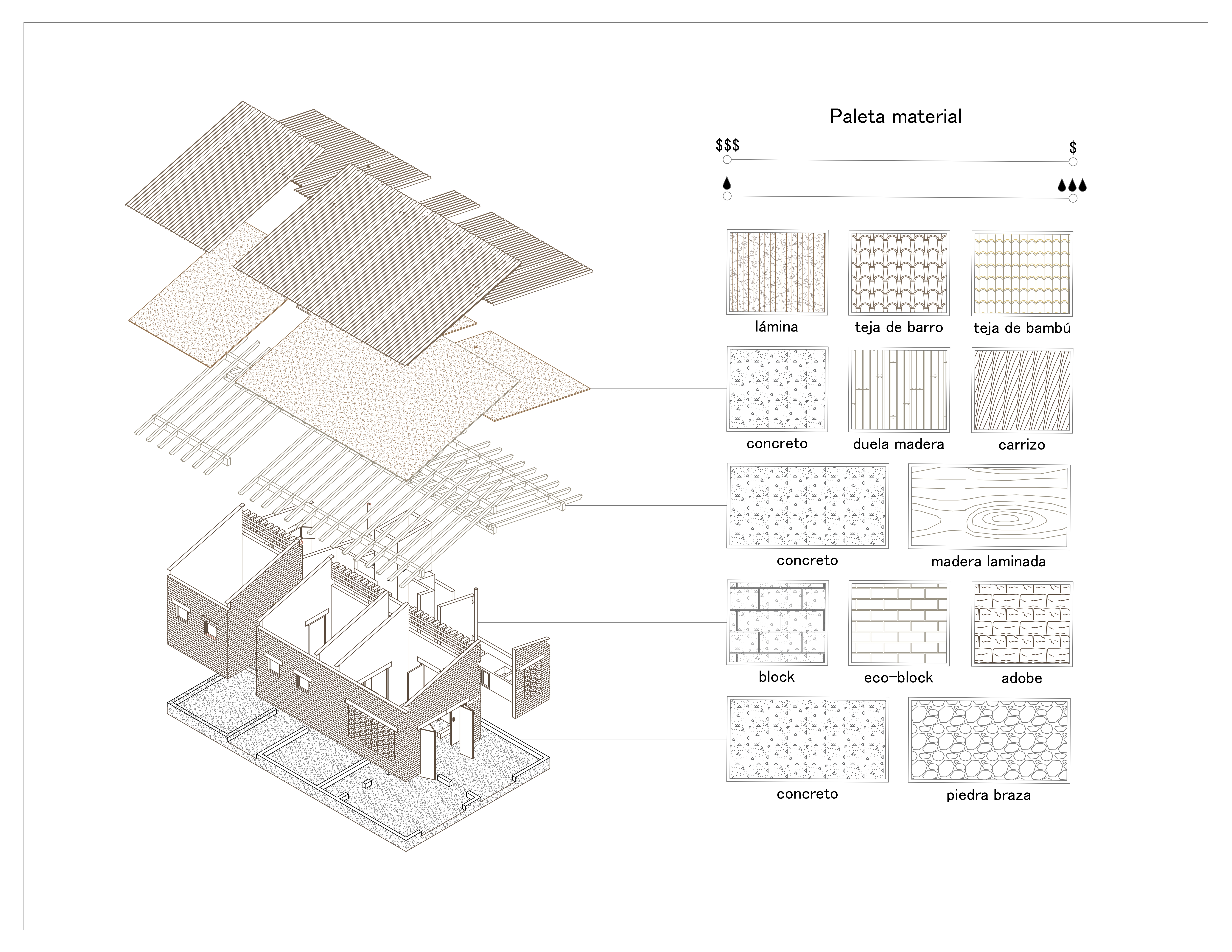 Se propone un prototipo de vivienda mínima bajo una lógica progresiva de construcción, diseñado para ser replicable no solo en La Guadalupe, sino en otros territorios rurales con condiciones de vida similares en la región. Su sistema estructural permite adaptarse a una amplia variedad de materiales, garantizando seguridad y funcionalidad independientemente de los recursos disponibles.La estrategia constructiva incorpora una paleta de materiales disponibles en la zona, considerando distintos rangos de precio, conocimientos constructivos populares y accesibilidad al agua, de modo que los usuarios puedan seleccionar los materiales según sus necesidades y presupuesto sin comprometer la estabilidad estructural.