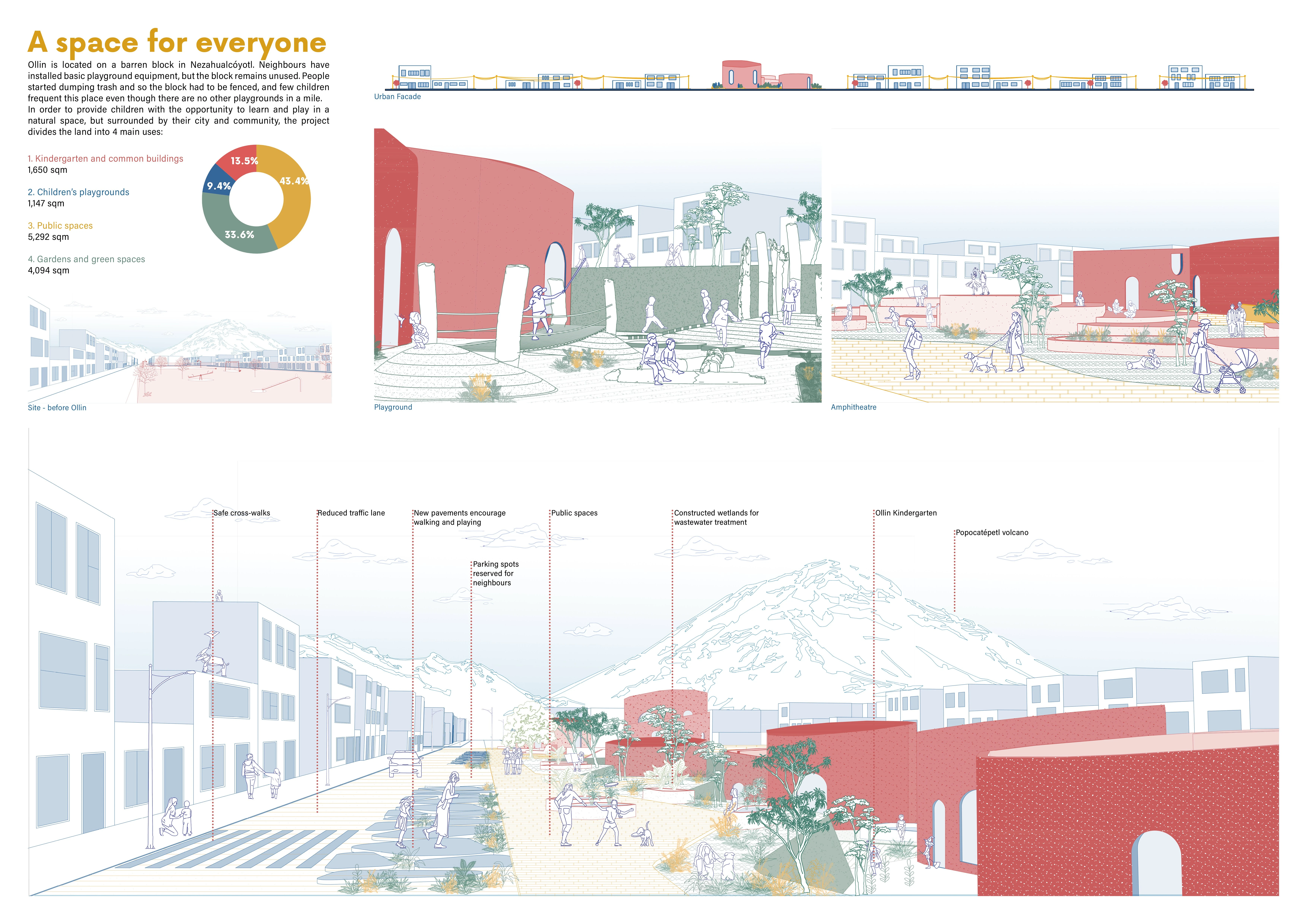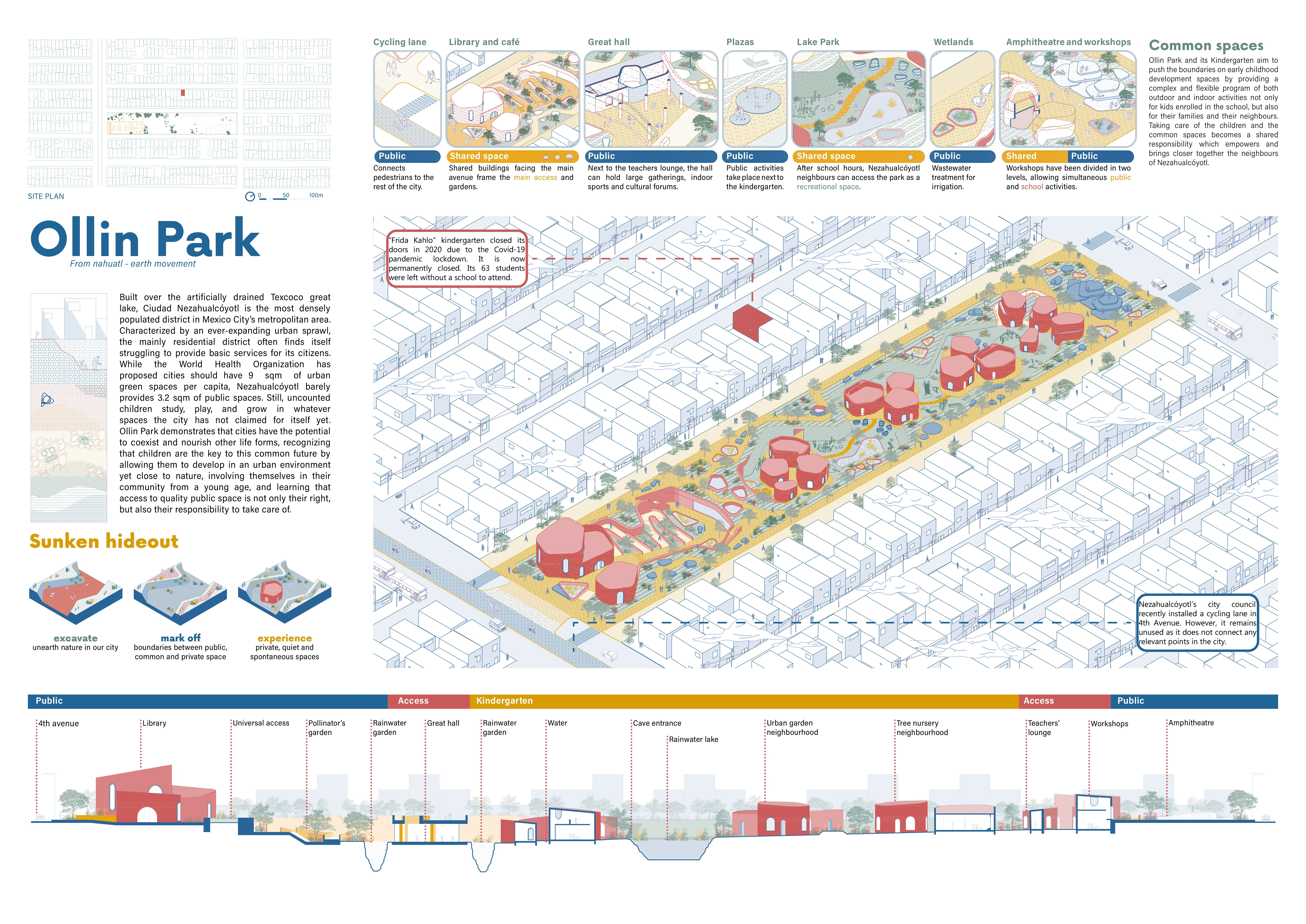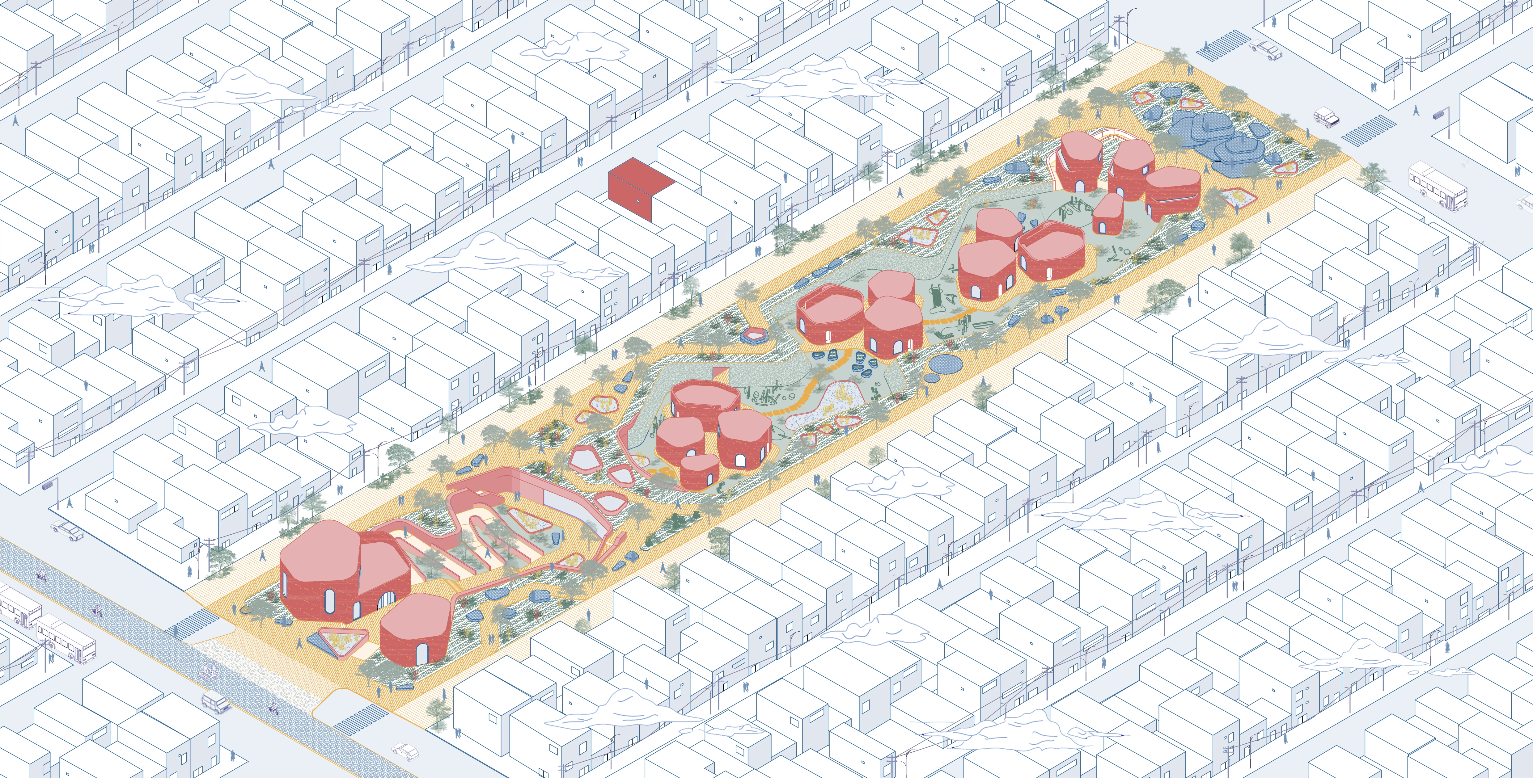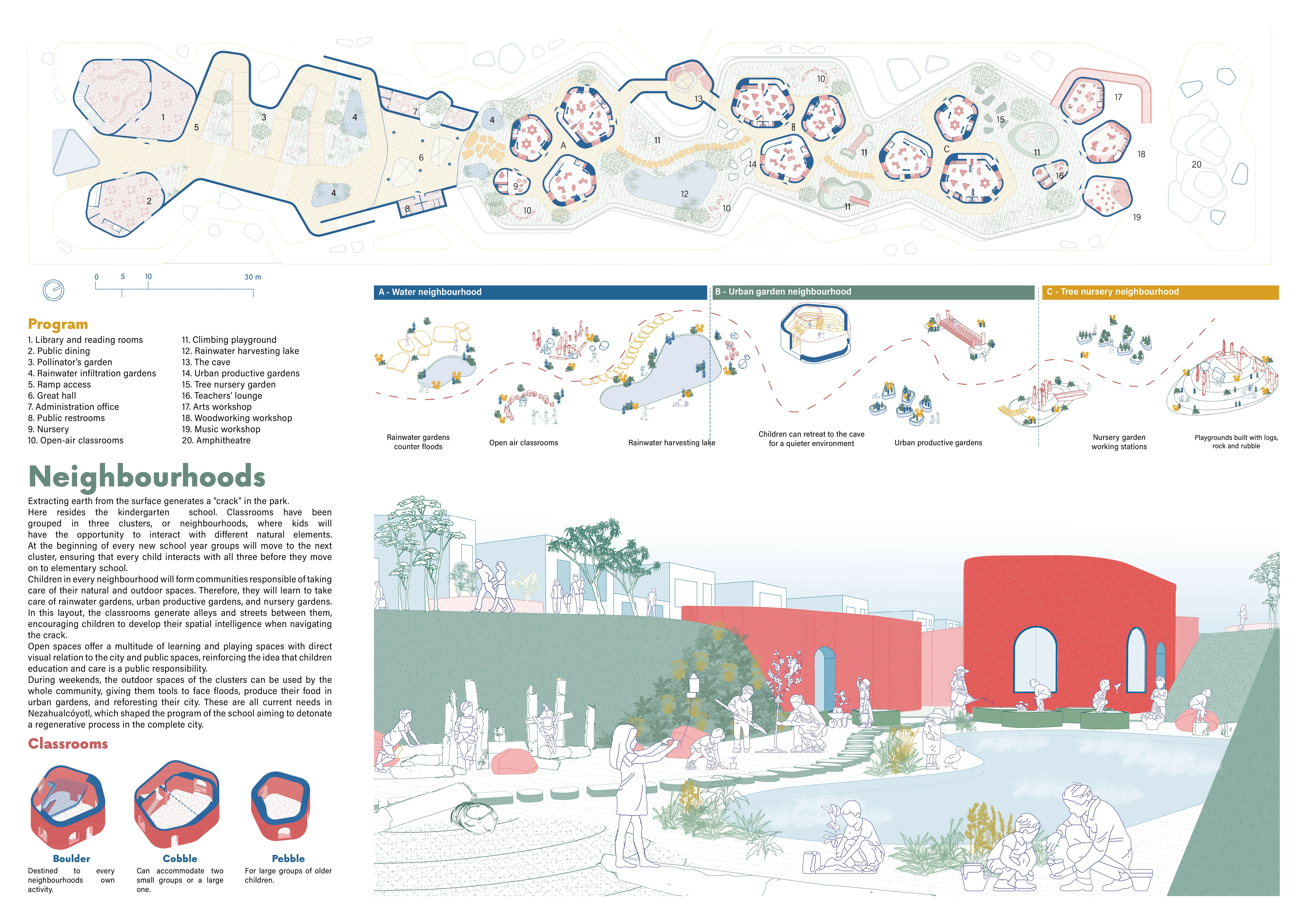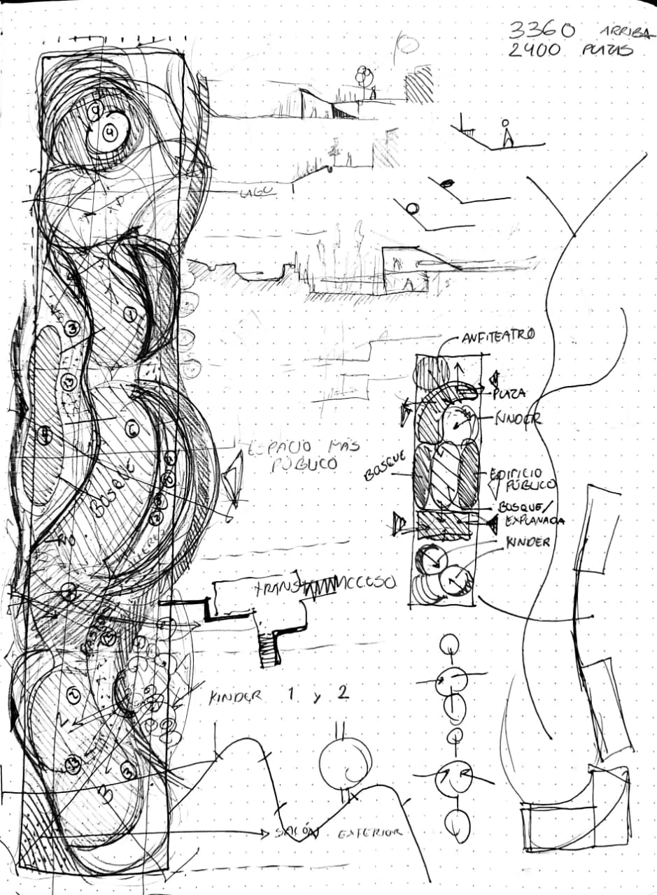 El proyecto combina un parque con un jardín de niños en una manzana subutilizada, diferenciando áreas públicas y privadas mediante operaciones topográficas. Una biblioteca, comedor, talleres y plaza con anfiteatro articulan espacios accesibles a toda la comunidad, mientras que los salones del kínder se organizan en tres “barrios” que fomentan autonomía, juego y cuidado ambiental.