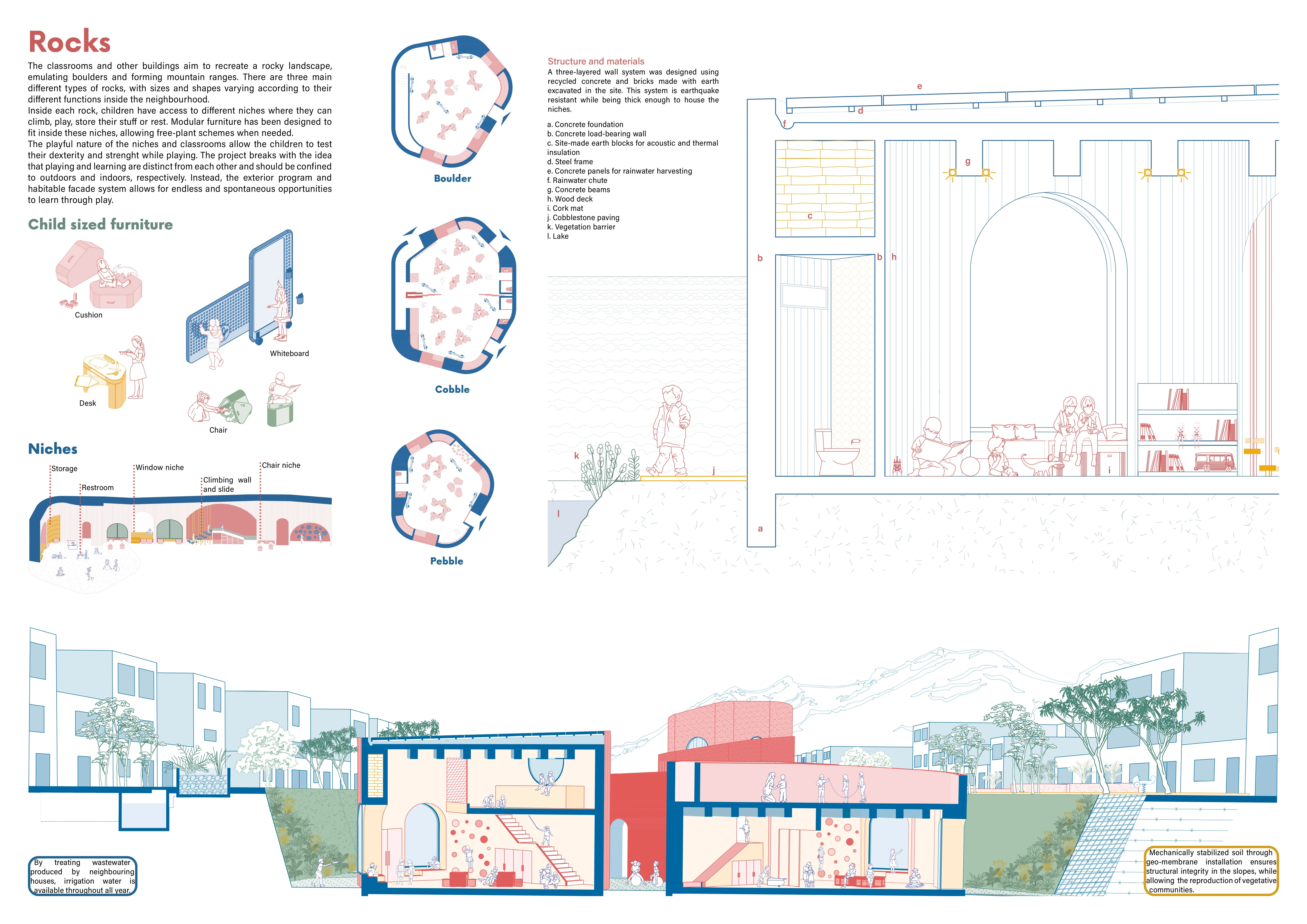 El diseño incorpora estrategias de gestión hídrica, como jardines de infiltración, humedales de tratamiento y un pequeño lago de captación pluvial, en respuesta a la condición dual que caracteriza Nezahualcóyotl: sequías prolongadas e inundaciones repentinas. Los volúmenes, inspirados en un paisaje de rocas, combinan concreto reciclado y tierra compactada, generando aulas, talleres y nichos que promueven la exploración y el aprendizaje activo.